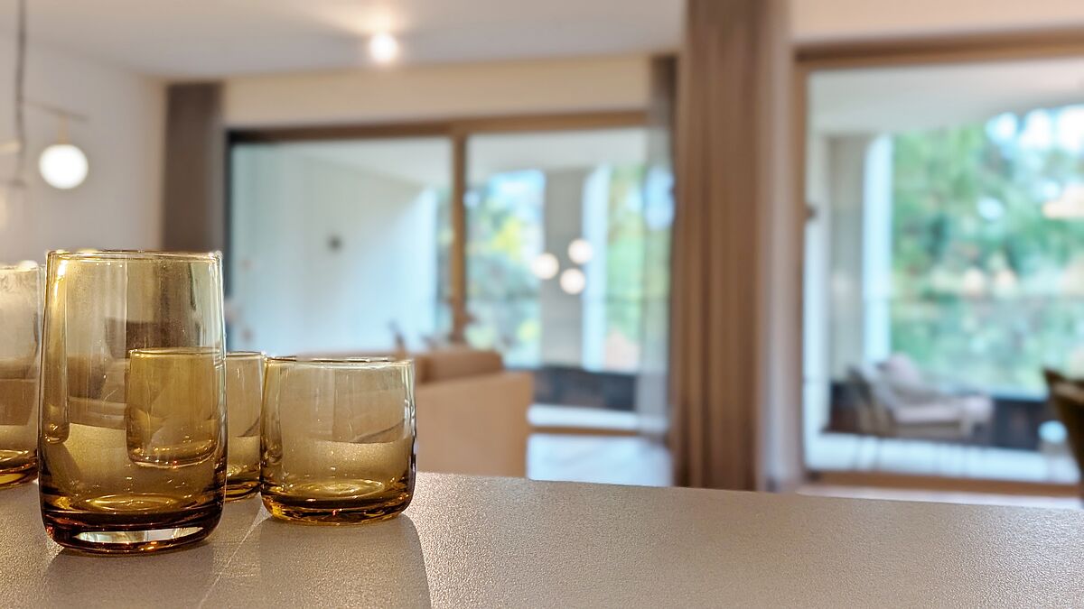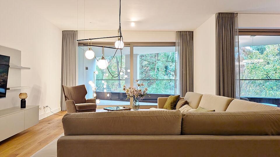 - Bodentiefe Fenster mit Dreifachverglasung sowie Sonnen- und Wärmeverglasung – lichtdurchflutete Räume bei optimalem Schall- und Wärmeschutz