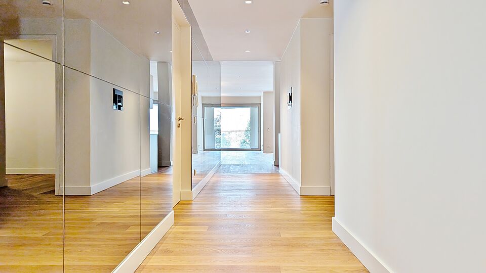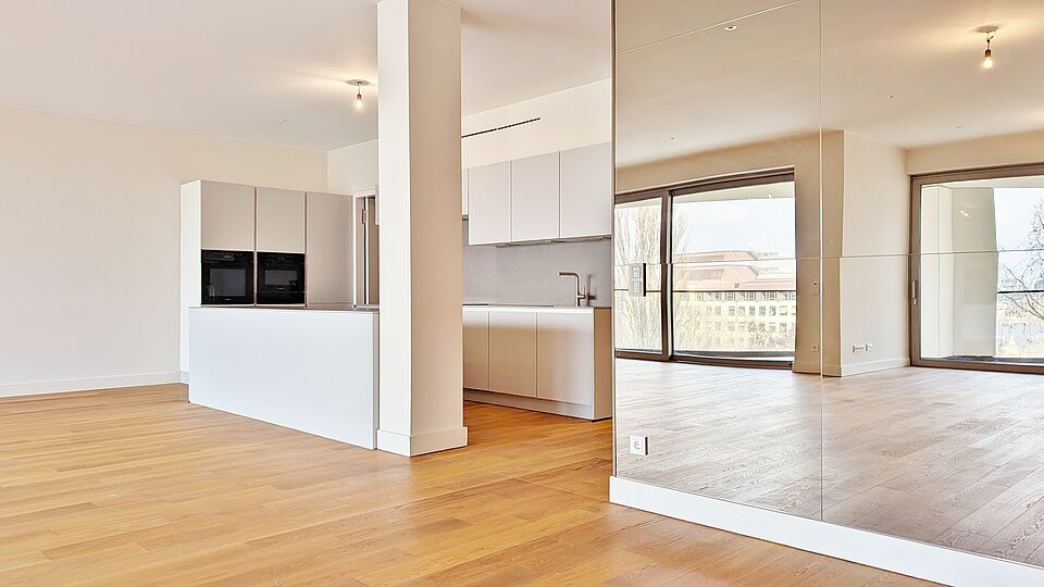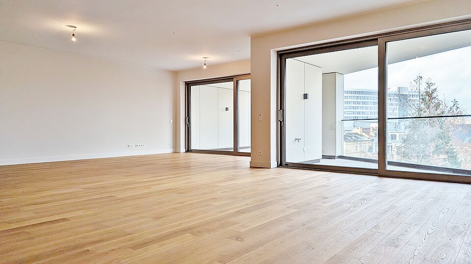 - Bodentiefe Fenster mit Dreifachverglasung sowie Sonnen- und Wärmeverglasung – lichtdurchflutete Räume bei optimalem Schall- und Wärmeschutz