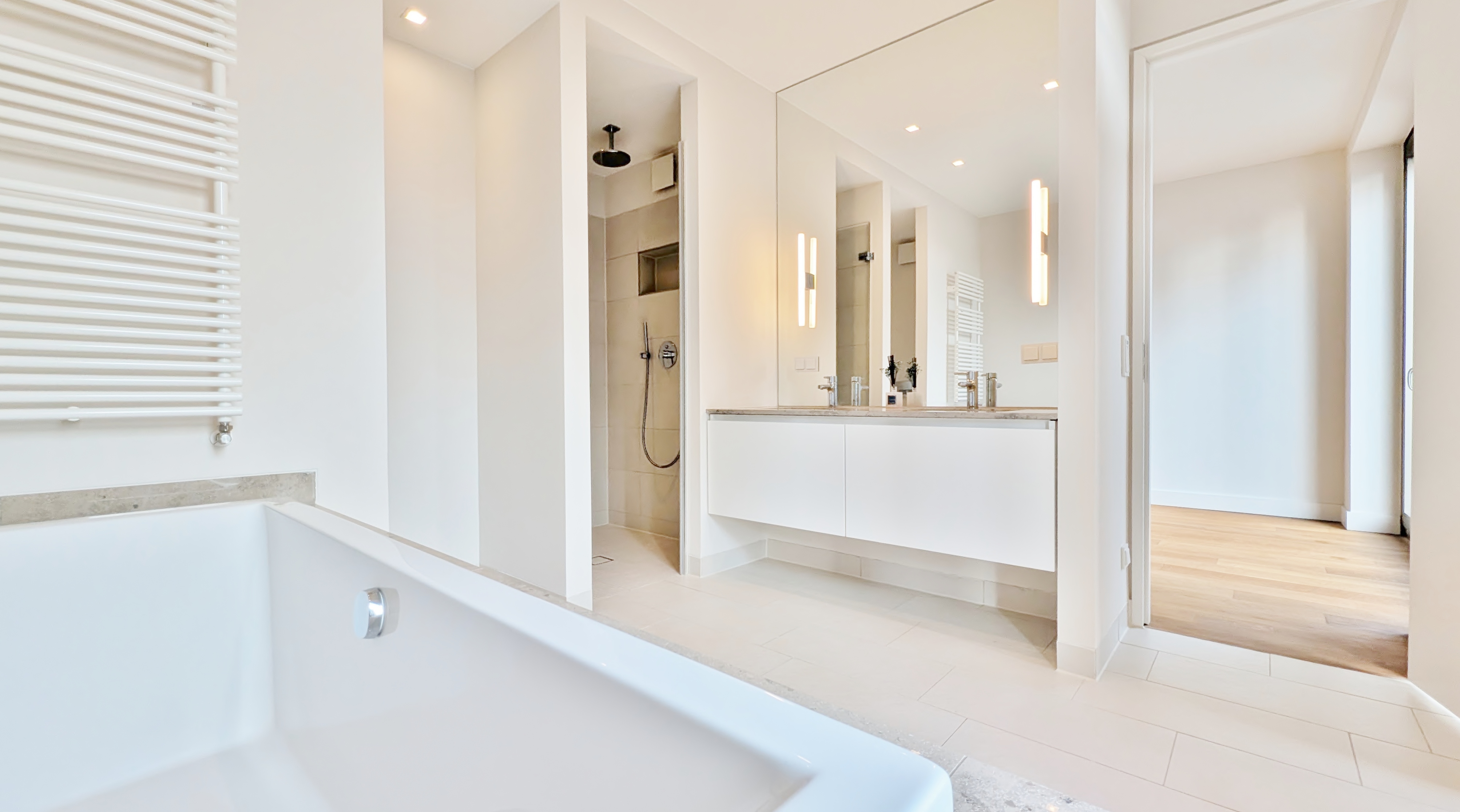 - Badezimmer mit eleganten Feinsteinfliesen – zeitloses Design, hochwertige Armaturen und durchdachte Details für ein modernes Wellnessgefühl