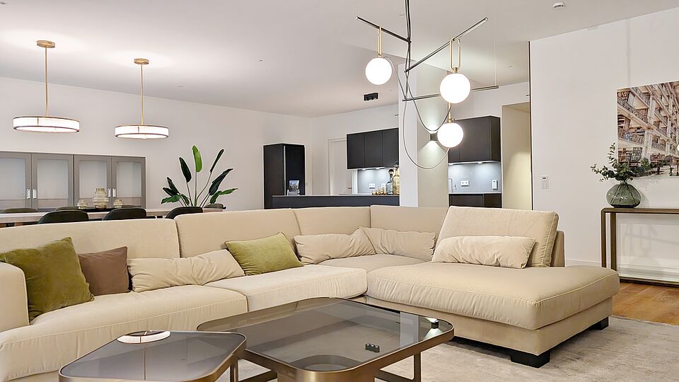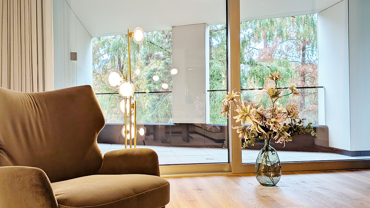 • Bodentiefe Fenster mit Dreifachverglasung sowie Sonnen- und Wärmeverglasung – lichtdurchflutete Räume bei optimalem Schall- und Wärmeschutz