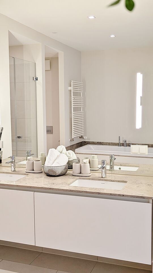 • Badezimmer mit eleganten Feinsteinfliesen – zeitloses Design, hochwertige Armaturen und durchdachte Details für ein modernes Wellnessgefühl