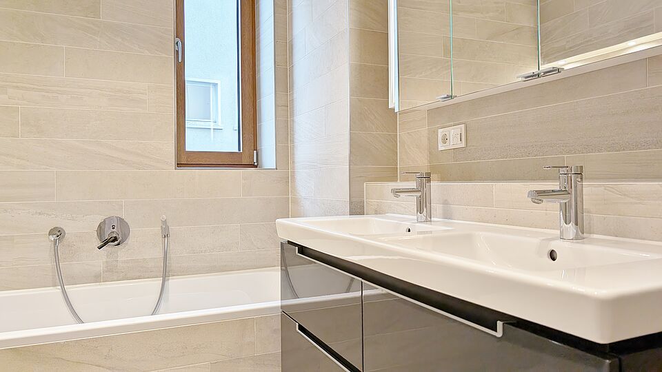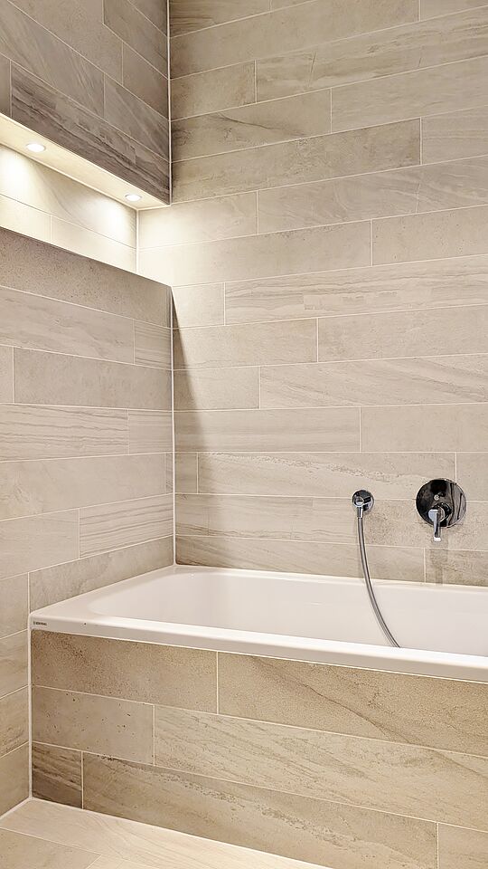 - Zwei elegante Bäder in exklusiver Natursteinoptik