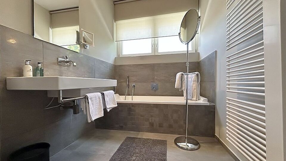 - Zwei elegante Bäder mit hochwertigen Natursteinfliesen