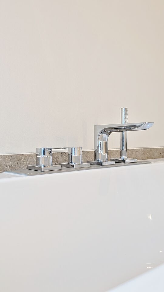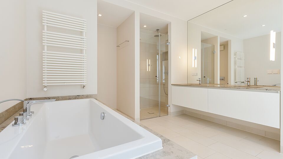 - Badezimmer mit eleganten Feinsteinfliesen – zeitloses Design, hochwertige Armaturen und durchdachte Details für ein modernes Wellnessgefühl