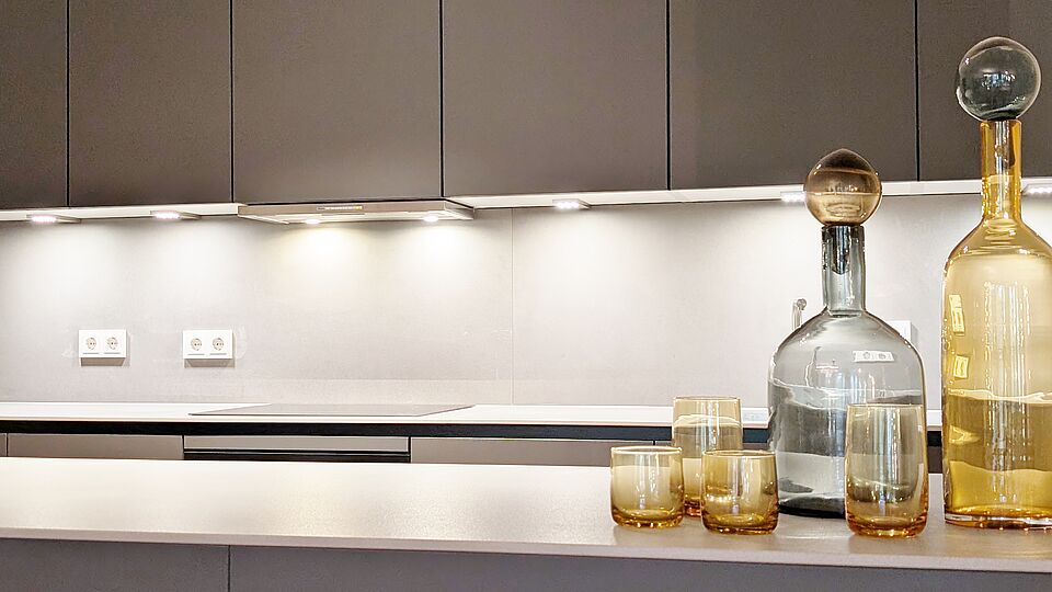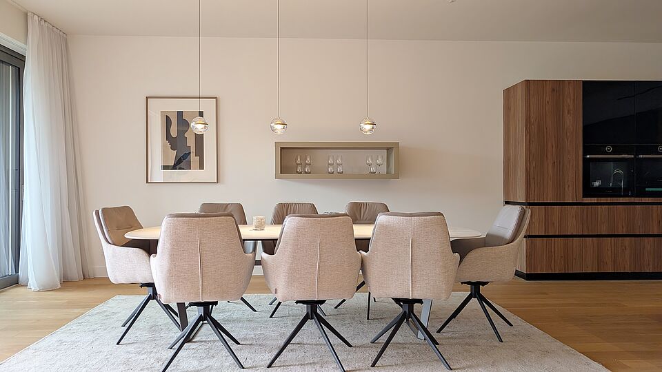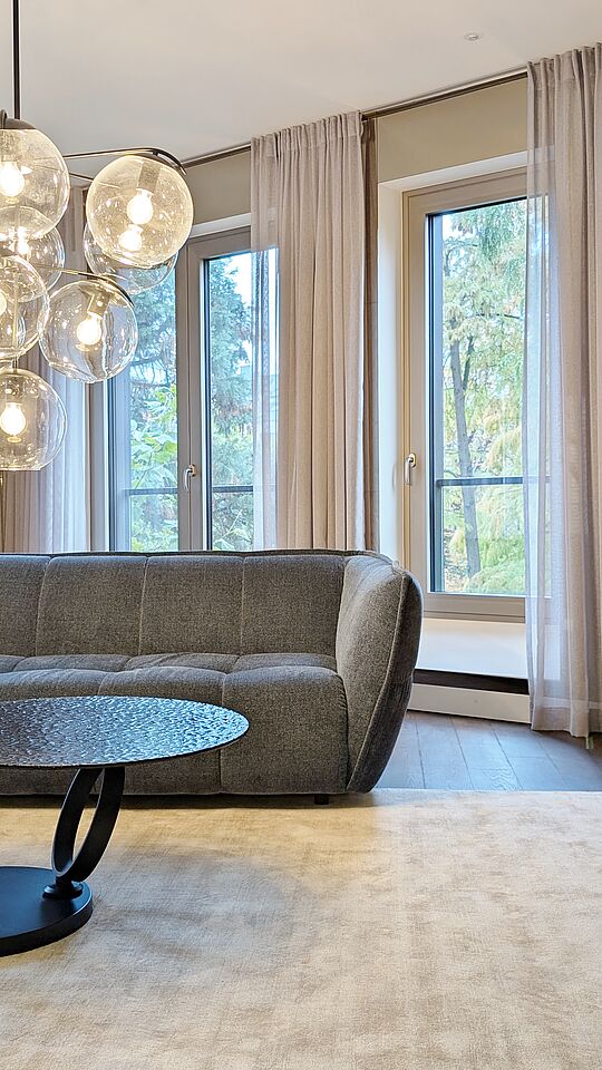 - Bodentiefe Fenster mit Dreifachverglasung sowie Sonnen- und Wärmeverglasung – lichtdurchflutete Räume bei optimalem Wärmeschutz